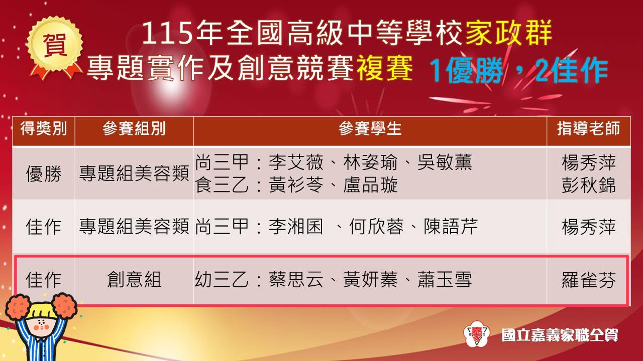 本校參加114家事類技藝競賽幼兒教具製作職種榮獲優勝個人獎第18名。